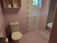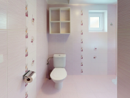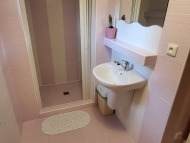 V koupelně je sprchový kout a toaleta, ubyvadlo a velké zrcadlo.
